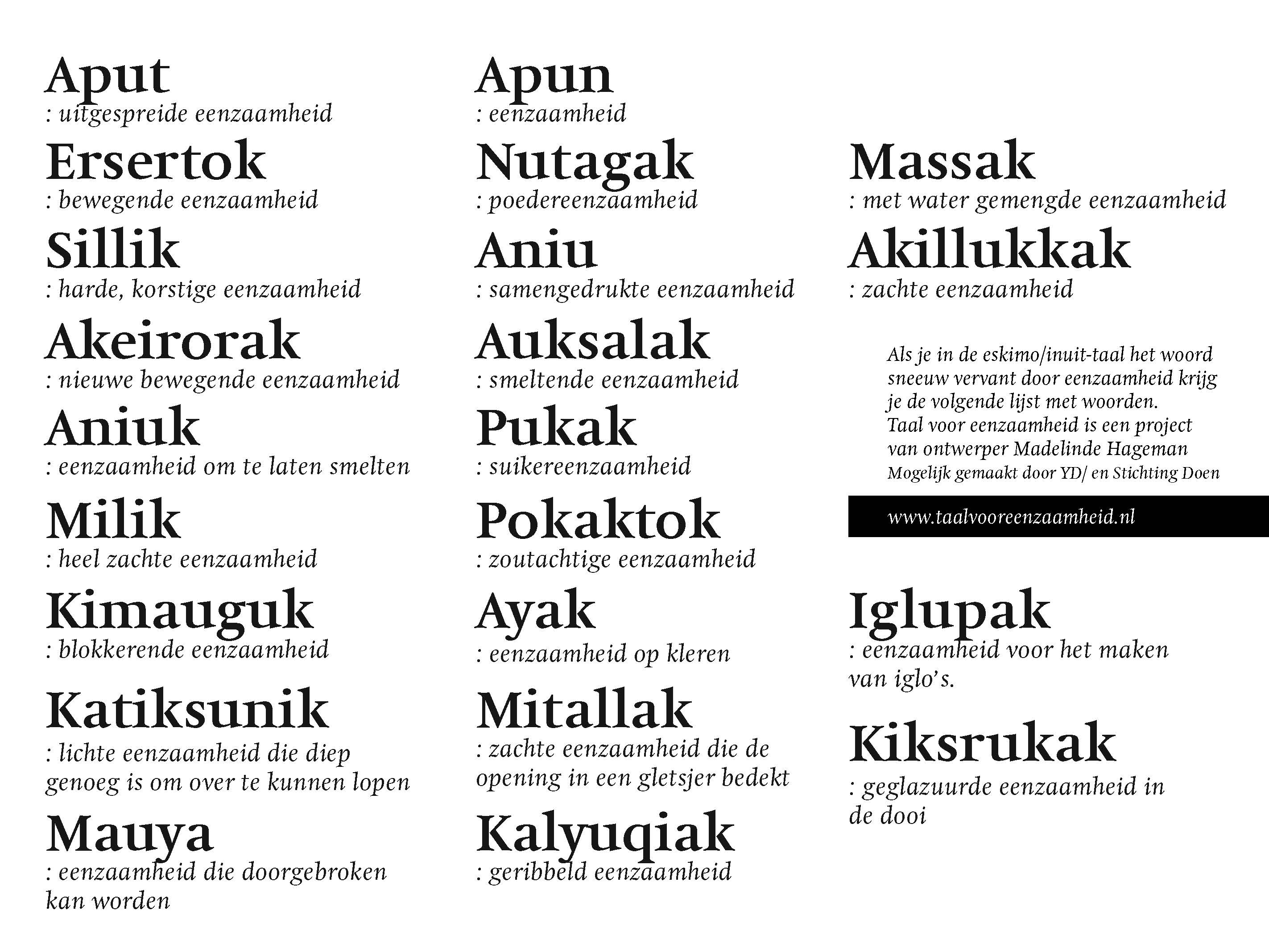 Het was haar opgevallen dat wij voor een enorme verscheidenheid aan eenzaamheidsbelevenissen slechts één woord gebruiken terwijl bijvoorbeeld de Inuit Eskimo-taal 21 verschillende benamingen kent voor sneeuw.