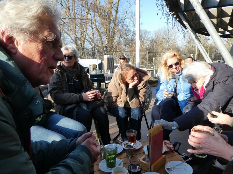 Omdat we zo genoten van het Amsterdamse Bos, gingen we nog een drankje drinken op het terras van De Bosbaan. Heerlijk in het zonnetje; het leek wel lente! De bus bracht ons terug naar de stad, waar we met een voldaan gevoel aankwamen bij de Appeltjesmarkt.